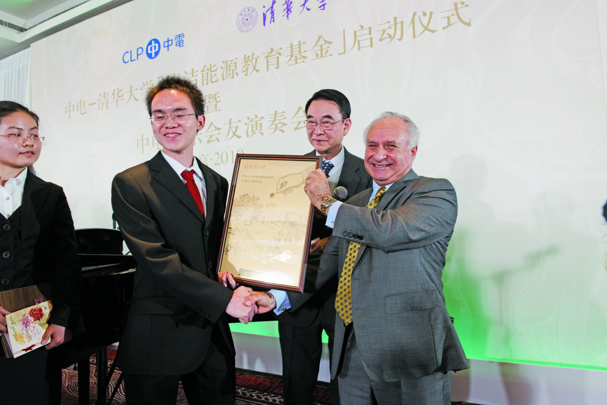 中电—清华大学 ”清洁能源教育基金” 启动仪式上,中电集团主席米高嘉道理爵士(右一)接受清华大学受助学生代表馈赠的荣誉证书。